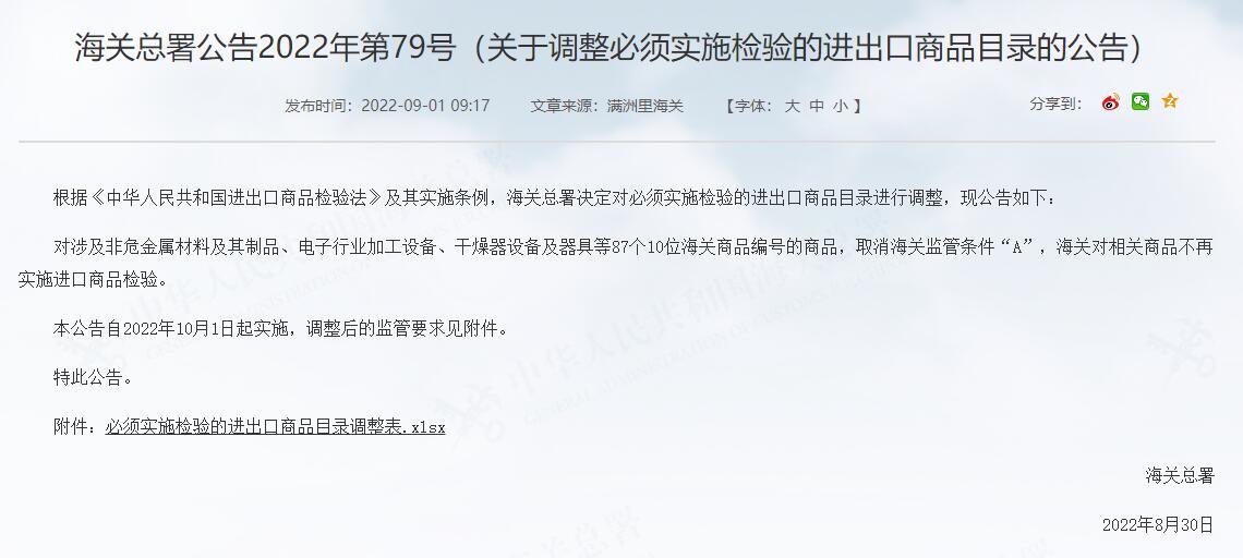 海關(guān)總署公告2022年第79號(hào)(關(guān)于調(diào)整必須實(shí)施檢驗(yàn)的進(jìn)出口商品目錄的公告)
