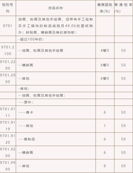 根據(jù)《中華人民共和國進出口稅則(2022版)》,繪畫作品的稅則號列和部分稅率如下(協(xié)定稅率及特惠稅率等詳見2022年稅則):