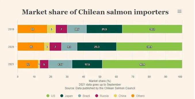 智利產地三文魚也呈現出供應減少、價格上浮的情況。據智利三文魚協會(ChileanSalmonCouncil)統計數據顯示,智利2021年第三季度出口約14萬噸養殖鮭鱒魚類,同比下降16%。從智利2021年1-9月的數據來看,美國、巴西的需求已恢復至疫情前水平,餐飲渠道需求的恢復和開發推動了智利三文魚對美國市場的出口量增加,并將價格維持在較高水平。而中國市場則尚未恢復,從2020年中期開始,市場需求一路下滑,雖然2021年第三季度同比增長20%,但仍低于疫情前的水平。