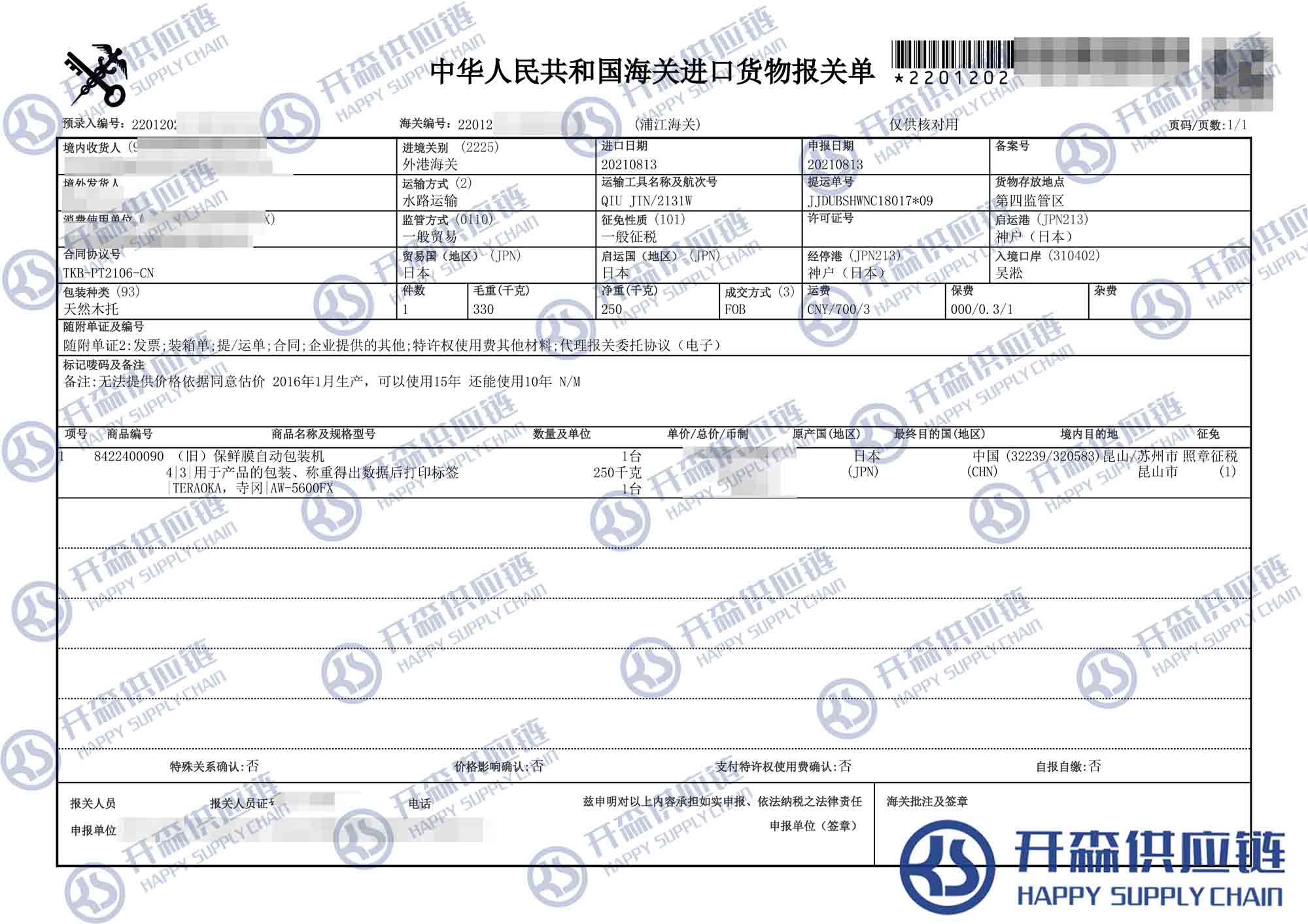 上海港日本舊保鮮膜自動包裝機(jī)進(jìn)口報(bào)關(guān)代理【進(jìn)口案例】