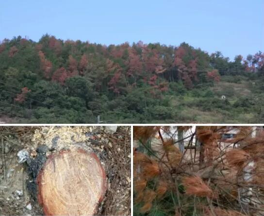 第四階段:針葉全部變為黃褐色或紅褐色,病樹整株干枯死亡,其木材橫截面呈藍色或藍灰色。